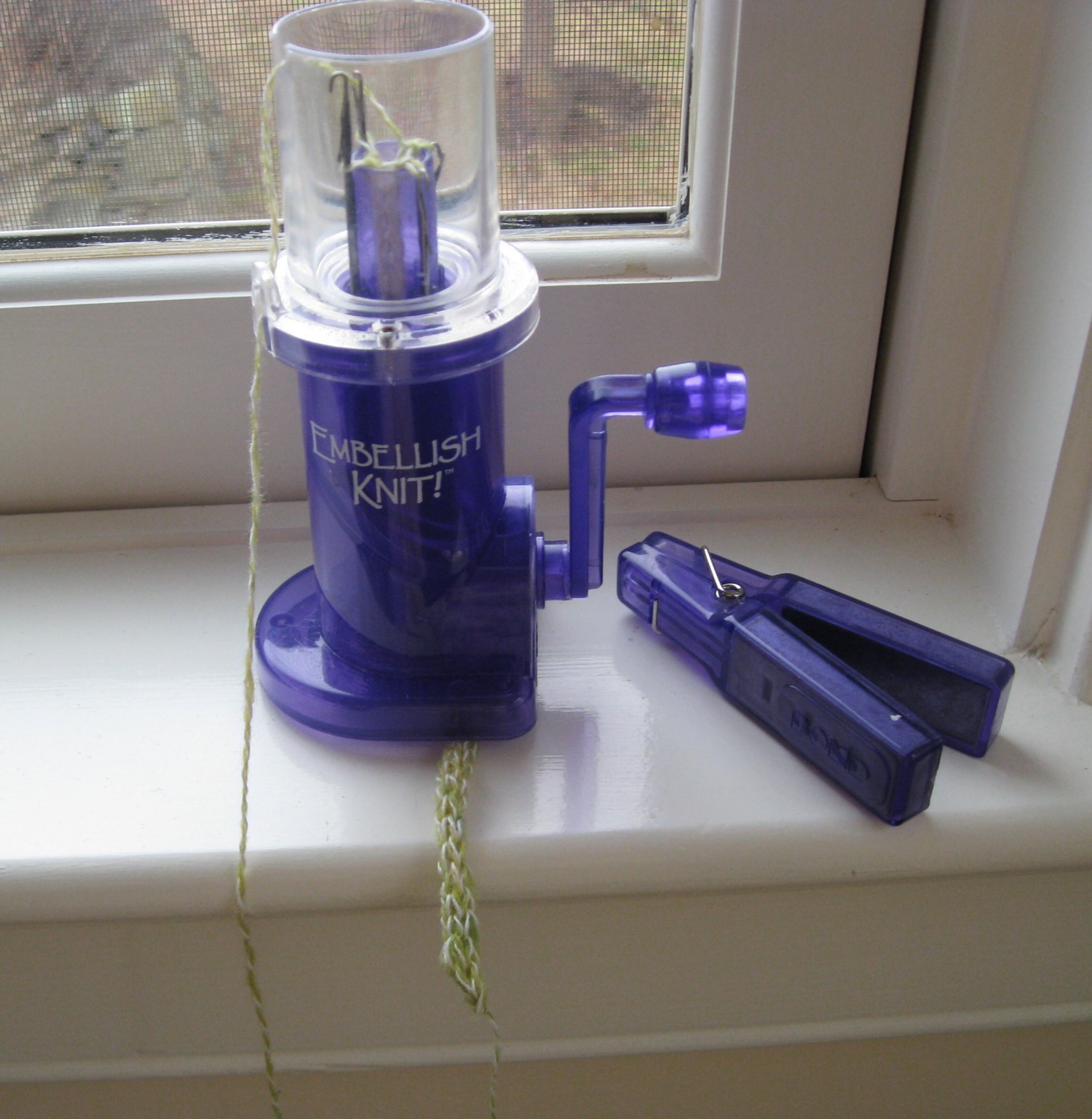 It's a simple little I-cord machine, The Embellish Knit. A tiny little 4 stitch circular knitting machine that does only one thing - I-cord - with only a couple of weights of yarn (fingering or sport, basically), but it does that one thing like a champion -- cranking out my 26" of I-cord in about 5 minutes. In the photo you can see a wee little tail of I-cord coming out of the bottom of the machine. Normally the weight (it's a clothespin with metal bits inside!) would be attached to the cord itself, but for photographic purposes I removed it. Does anyone need such a Johnny One Note gadget? Nope, not at all -- but I sure am glad I had it!